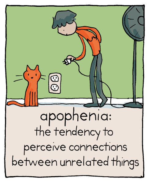 Apophenia, the human tendency to see patterns in random things illustrated by Grant Snider (one of a series of random words comics).