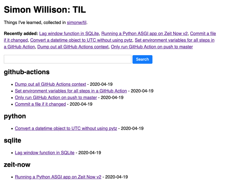 Using GitHub Actions to updatge the README of a repository of short tips & tricks articles. (Via Simon Willison on Twitter) Using a self-rewriting README powered by GitHub Actions to track TILs I’ve started tracking TILs—Today I Learneds—inspired by this five-year-and-counting collection by Josh Branchaud on GitHub (found via Hacker News). I’m keeping mine in GitHub too, and using GitHub Actions to …