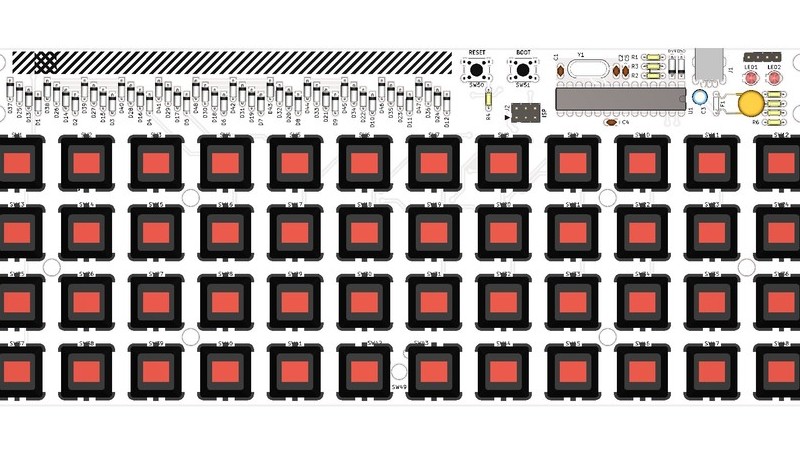 Plaid is a 4x12 ortholinear USB keyboard kit using only through-hole components. The microcontroller, diodes and other components are artistically arranged at the top of the PCB.