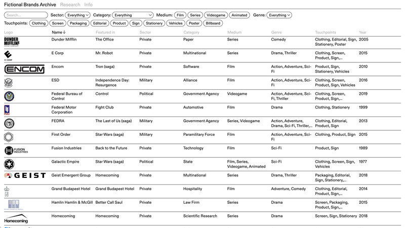 Fictional brands archive: a table of information about brands of companies and institutions in films, games, and animation, originating as a master’s thesis in brand design.